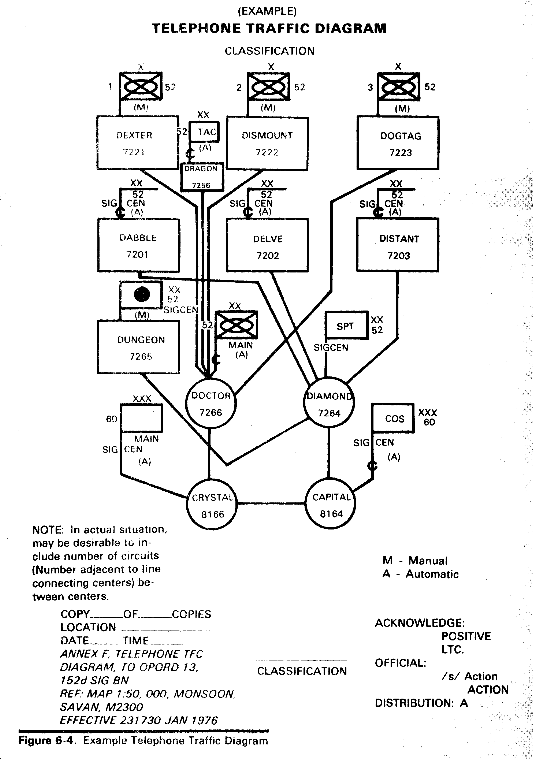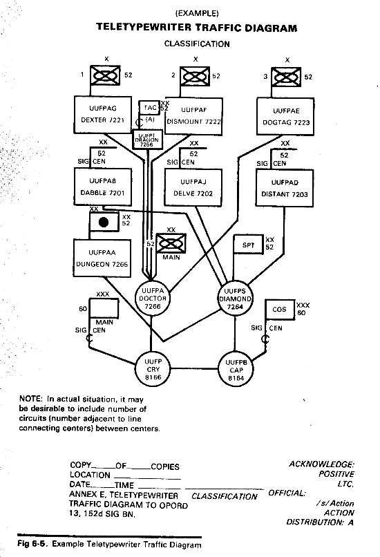 A traffic diagram is a schematic representation of traffic routing information. The purpose of a traffic diagram is to provide a simplified reference for determining trunk routing within the communications network. Separate diagrams are used for telephone (fig 6-4) and teletypewriter/data (fig 6-5) networks. Traffic diagrams are typical of circuits installed but do not prescribe the exact circuits installed in every system. The diagrams should show the traffic flow among all elements of the major command and the principal routes to other networks and installations.