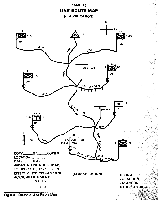 A line route map is used to specify and record the wire and cable routes in a communications system. In also pinpoints the locations of the facilities associated with the lines. The line route map is keyed to a topographic map(s) or map substitute and is usually prepared as an overlay (fig 6-6).