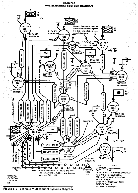 The multichannel systems and radio net diagrams contain the basic information necessary for the proper organization and operation of multichannel systems links and radio nets. The diagrams provide data required for frequency utilization and reduction of interference. They way also include information that specifies operating modes and conditions.
