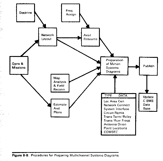 (2) Preparation. The C-E section of a major command and the senior signal unit prepare multichannel systems diagrams during the planning phase. The preparation procedure is shown in figure 6-8.