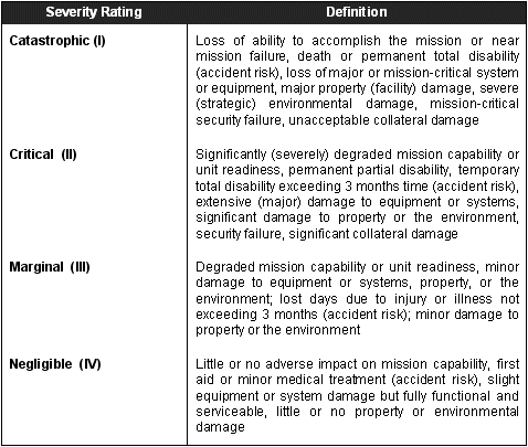 2-66. Assessments include two factors: probability and severity. Probability is how often a hazard (environmental) is likely to occur. Severity is the effect a hazard will have expressed in terms of the degree of injury or illness, loss of or damage to equipment or property, environmental damage, and other mission-impairing factors, such as loss of combat power. 2-67. Probability and severity are estimates that require individual judgment and a working knowledge of the risk management process and its terminology. Figure 2-10 defines the four degrees of severity, and Figure 2-11 the five degrees of probability for a hazard. Refer to Chapter 2 of FM 100-14 for a more in-depth discussion of these substeps as they relate to assessing environmental hazards to determine risk. 2-68. Leaders must assess the probability and the potential severity of environmental damage. Commanders use common sense, past evaluations, higher commander guidance, historical data, lessons learned, and any other useful sources to determine the probability of an event occurring. Severity, however, attempts to quantify the amount of potential damage created by an event. For example, the probability of a fuel spill occurring during an exercise might be remote. However, if the spill occurs in a body of water where the fuel will spread quickly, the potential severity could be catastrophic. In this example, the unit commander may choose to limit the potential severity by locating the fuels away from the body of water. While leaders must assess the probability of environmental damage, they must also determine how much damage the event would cause, regardless of the probability.