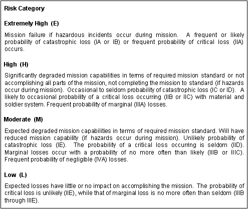 2-57. Tactical risk and accident risk may be diametrically opposed. The commander may choose to accept a high level of environmental-related accident risk to reduce the overall tactical risk. For example, a commander may decide to destroy an enemy's petroleum storage area to reduce his overall tactical risk. |