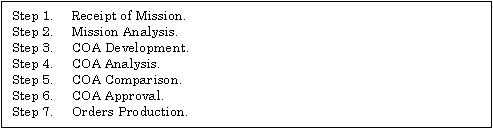 2-1. The MDMP (see Figure 2-1) is defined in FM 101-5. It relies on doctrine, especially the terms and symbols (graphics) found in Operational Terms and Graphics. The MDMP helps the commander and his staff examine the battlespace and reach logical decisions. The process helps them apply thoroughness, focus, sound judgment, logic, and professional knowledge to reach a decision. From start to finish, the commander's personal role is central. His participation in the process provides focus and guidance to the staff. The commander uses the entire staff during the MDMP to explore the full range of probable and likely enemy and friendly courses of action (COAs), and analyze and compare his own organization's capabilities with the enemy's. This staff effort has one objective-to integrate information collectively with sound doctrine and technical competence to assist the commander in his decisions, ultimately leading to effective plans. The selected COA and its implementing OPORD are directly linked to how well both the commander and staff accomplish each phase of the MDMP.