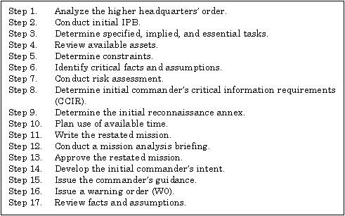 2-5. Mission analysis has 17 subordinate steps. While this process results in the staff formally briefing the commander, there may be items of such importance to the commander and the formulation of his commander's guidance that they need to be brought to the commander immediately rather than waiting until the formal briefing. If a staff officer has developed good tools to facilitate mission analysis, he dramatically increase his ability to be effective. 2-6. The 17 subordinate steps of mission analysis provide the framework for success in the MDMP. It is essential to perform effective work at this point in the process. Some steps will prove to be more vital than others in the application of environmental considerations. The steps in mission analysis are included in Figure 2-4.