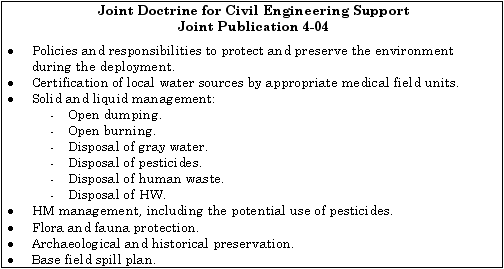 2-7. The commander and his staff thoroughly analyze the higher headquarters' order and identify guidance on environmental consideration. The level of the CINC is the logical echelon for civil-military interface, and is the echelon that typically initiates military environmental guidance. If confused by the higher headquarters' order or guidance, the staff must immediately seek clarification. While there is generally a specific annex or appendix on environmental considerations in the higher headquarters' order, it is not the only source of guidance. Coordinating instructions or guidance from the G4 and others may also contain information critical to environmental considerations. |