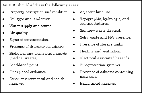 2-44. Many operations require fixed facilities, structures, or other real property as logistics, command and control, administration, communications, billeting, base camp, or other mission purposes. If the tactical situation permits, commanders conduct or direct an initial EBS before occupying the AO. An EBS is typically performed by or with support from, installations, corps, divisions, or higher HQs. However, brigades and even task forces may need to perform an initial EBS without much assistance from higher HQs. This situation would typically arise as a result of the initial reconnaissance of a proposed site. See Appendix B for additional EBS guidance and an example. See Chapter 5 for a discussion of base operations (BASOPS)-related information. 2-45. The initial EBS serves as a tool to assist in determining whether a parcel of land is acceptable for military use. The initial question should always be whether the site is healthy for soldiers and Marines. It documents the proposed site's existing environmental conditions and the likelihood of past or ongoing activities that may have created environmental, safety, or health problems. These problems include contamination of air, soil, groundwater, and surface water by toxic substances or POL. 2-46. Units conducting an initial EBS concern themselves with locating and documenting the presence or likely presence of any HM/HW or petroleum products on the property. An initial EBS will be focused on conditions indicating existing or past release, or possible release of toxic substances into structures, or the air, ground, groundwater, or surface water. 2-47. The person conducting the initial EBS will frequently be the unit's environmental officer, but the surveyor could be a member of a service's real estate team, preventive medicine personnel, a government or contract environmental engineer, quartering party personnel, or even a unit's reconnaissance element. Regardless, environmental knowledge and training will be key to the surveyor's success. He conducts and documents the initial EBS according to the tactical situation, mission, intended use of the facility, and time and personnel available.