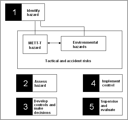 2-62. FM 100-14 describes the five risk management steps. Leaders may use the document worksheets found in Appendix F to assist them in tracking these steps. Figure 2-8 shows the relationship of environmental hazards to the total risk management process. 2-63. The following steps identify specific environmental considerations that the commander and his staff must consider: