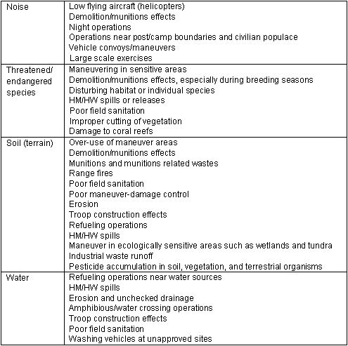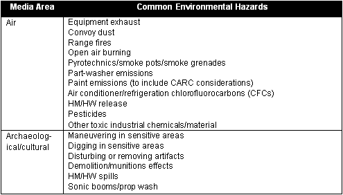 2-64. Commanders and staffs identify environmental hazards during mission analysis. FM 100-14 defines hazards as any actual or potential condition that can cause injury, or illness to, or the death of personnel; damage to or loss of equipment or property; or mission degradation. Environmental hazards include all activities that may pollute, create negative noise-related effects, degrade archaeological/cultural resources, or negatively affect threatened or endangered species' habitats. They also include environmental health-related hazards as further defined in Chapter 7. Figure 2-9 provides common environmental hazards identified by environmental media areas. |