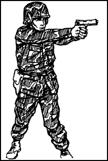 .b. Standing Position without Support. Face the target (Figure 2-9). Place feet a comfortable distance apart, about shoulder width. Extend the firing arm and attain a two-hand grip. The wrist and elbow of the firing arm are locked and pointed toward target center. Keep the body straight with the shoulders slightly forward of the buttocks.