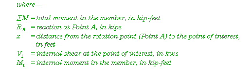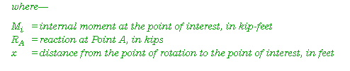 E-23. To find the internal moment, sum the moments of all the forces to the left of the point of interest (Figure E-9). The best assumed point of rotation is at the center of the point of interest. Begin at the far left of the diagram and work to the moment at the point of interest (Figure E-10) using the following equation: