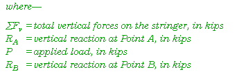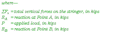 E-12. These three conditions of static equilibrium are useful in analyzing the loading of structural members in a fixed bridge. For example, Figure E-7 shows a simply supported stringer in equilibrium with a 10-kip load acting vertically at midspan. To design the supports, use the three conditions for equilibrium to determine the reactions at Points A and B. For this example, ignore the dead-load effects of the stringer.