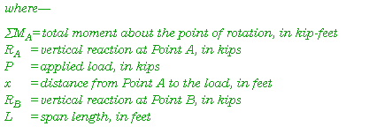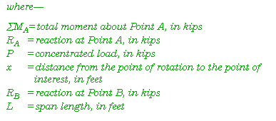 E-15. Start at the left support (Point A) and sum all the moments caused by all the forces acting on the beam. The moment caused by a force equals the load multiplied by the perpendicular distance from the force's line of action to the point of rotation. Since all the forces acting on the beam are vertical, find the horizontal distance from the point at which the load acts to Point A. Sum all of the forces about Point A as follows:
