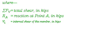 - To compute the internal shear of the beam, start at the far left and sum all of the vertical forces to the point of interest (Figure E-17) as follows: