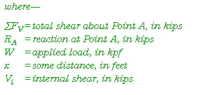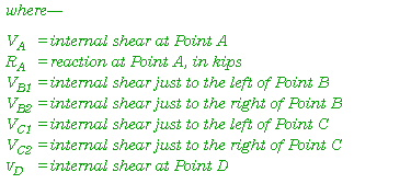E-22. To determine the internal shear force, set the sum of the total vertical forces equal to zero. In Figure E-8 then, the only forces acting on the beam are the 5-kip reaction at Point A and the internal shear force. To work out the units correctly, always analyze the free-body diagram to the left of the point of interest. Begin at the far left of the diagram and work to the shear at the point of interest (Figure E-9) using the following equation: