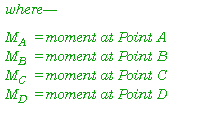 E-30. The key points for moment are at the points of the applied loads (Points A, B, C, and D in the diagram). To find the values for internal moment at the key points, start at Point A and work to the right, summing all of the moments (listed in equation E-15) to the left of the point of interest. A moment is a force times the perpendicular distance between the line of action of the force and the point at which moments are summed.