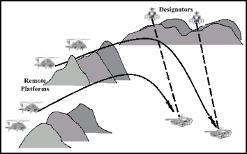 4-19. Remote Hellfire engagements avoid most of these problems (see Figure 4-2), but they may increase the time of flight of the missile. A remote engagement limits the number of aircraft exposed for tracking and lasing targets. When engaging with remote fires, a designating team is placed in a position overwatching the enemy's route of march. The remaining aircraft position themselves in covered and concealed battle positions oriented on the engagement area. If possible, these battle positions should be located below the reverse military crest or the counterslope of the ridgeline paralleling the engagement area. Aircraft in these battle positions will act as remote platforms by providing missiles to the designators without unmasking. This tactic prevents the enemy from achieving line of sight on the firing aircraft.
