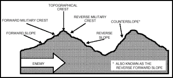 4-71. During a movement to contact, the advance guard normally advances in column, moving continuously or by bounds, until it makes contact. While requiring less physical exertion, movement along the topographical crest of a ridgeline increases the possibility of enemy observation and should normally be avoided. Given adequate concealment, this exposure may be reduced by moving along the military crest. Ridgelines and crests can often provide a tactical advantage to the force that controls them. Their control may allow rapid movement from one terrain compartment to another and afford excellent observation into lower terrain levels. In all cases, commanders must address the control or clearance of ridgelines that dominate their planned avenues of approach.
