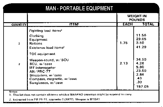 The team is limited to carrying only two Stinger weapons. In addition, team radios (man-packed) (air assault and airborne only), extra BCUs, individual weapons, and binoculars must be carried. The amount of equipment team members must carry limits their range and mobility during dismounted operations. Weights will vary according to what items are carried as indicated in illustration. Under foot march conditions, it is essential that weight be minimized and the load balanced. Multiple sling loads are difficult to carry for extended periods. Both Stinger and the M16 rifle are sling-carried weapons. Soldiers other than members of the Stinger team must be detailed as ammunition bearers to carry the remainder of the basic load. See appendix C for table of Stinger equipment weights and measures.