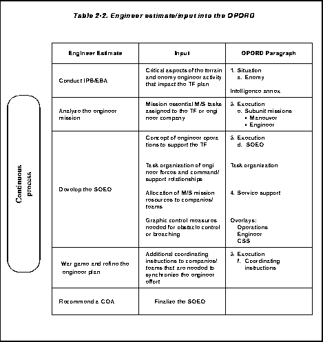 The engineer estimate is the primary tool that engineers use to facilitate planning in the TF. The estimate allows the TF engineer to integrate his company's capabilities as a combat multiplier into the TF's plan. The estimate allows the timely development of an SOEO and facilitates the early employment of engineers.