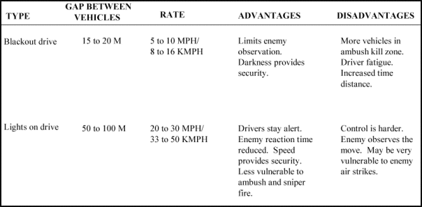 - Effectively using protective measures, including maintaining the prescribed vehicle interval, radio discipline, and blackout driving during night convoys.