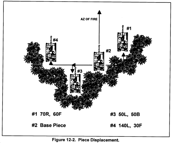 b. Piece displacement (Figure 12-2) can be determined by estimation and/or pacing, by hasty traverse, or by survey. Usually, estimation and pacing are not accurate enough for the large displacement distances involved in firing unit positions. The hasty traverse technique is a quick, accurate means of determining piece displacement by using the M10 or M17 plotting board. The survey technique provides grid coordinates for each weapon location.