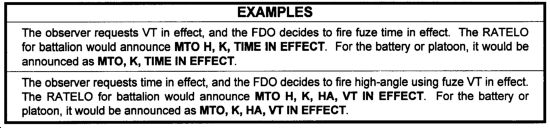 b. Changes or Additions to the Call for Fire. The second element of the MTO allows the FDC to inform the observer of changes and/or additions made by the FDO to the call for fire. If high-angle fire is to be used, HIGH ANGLE must be included in the MTO if the observer did not request it. The following examples use the previously stated call signs.