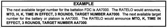 d. Target Number. The last element is the target number assigned to the mission for reference purposes, it is always announced. This is done to avoid confusion if multiple missions are being fired or if more than one observer is operating on the radio net. Target numbers are used in sequential order based on the units target block. The following example uses the previously stated call signs, change(s) to the call for fire, and number of rounds.