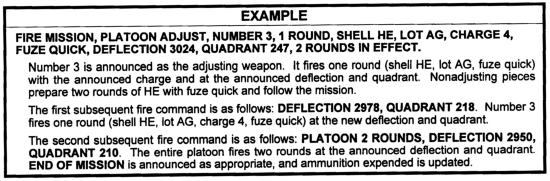 a. Following is an example of an adjust-fire mission without fire command standards applied for a four-howitzer platoon.