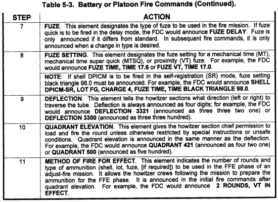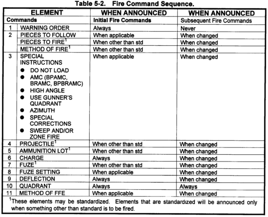 a. The elements of fire commands are always announced in the same sequence (Table 5-2). This saves time and eliminates confusion; each member of the howitzer section knows the sequence and should be ready for the next command.