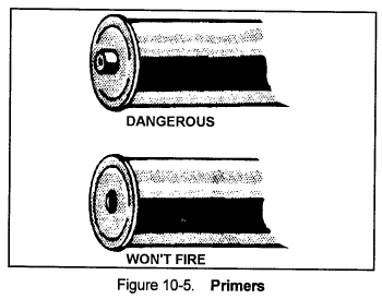 c. The primer must be flush with the base of the cartridge. If it sticks out too far, it is dangerous. If it sits in too far, the round will not fire. (See Figure 10-5).