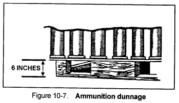 (2) If ammunition is being stored on the ground, use good strong dunnage at least 6 inches high under each stack (Figure 10-7).