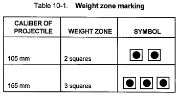 b. Weight. Variations in weight are inherent in the manufacture of projectiles. Since a high degree of accuracy is required in artillery firing, one must compare the data stenciled on the projectile (Figure 10-2) with the data provided in the firing tables to obtain the proper ballistic corrections. The weight zone marking symbols for projectiles are shown in Table 10-1.