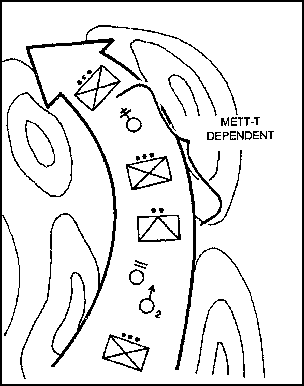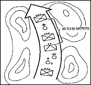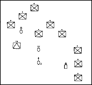 (6) Echelon right or left. This formation is used if the situation is vague and enemy contact to the front or on one of the flanks is likely. Normally, an obstacle or another friendly unit exists on the flank of the company opposite the echeloned flank. This prevents enemy contact on that side. This formation provides a good volumn of fire and protection to the echeloned flank. Figure 3-7 depicts one example of the echelon right formation; it shows the lead platoon in echelon left, the middle platoon in wedge, and the last platoon in column.