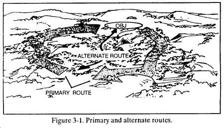 c. Primary and Alternate Routes. The leader selects primary and alternate routes to and from the objective (Figure 3-1). The return routes should differ from the routes to the objective.