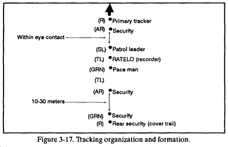 - The configuration of the platoon must provide security for the tracking team to the front and flanks as it follows the trail. The formation of a squad conducting a tracking patrol is in Figure 3-17. Separate elements of the squad must move as dispersed from each other as terrain and vegetation allows, and still maintain visual contact. Normally, the lead fire team is responsible for point security, tracking, and navigation.