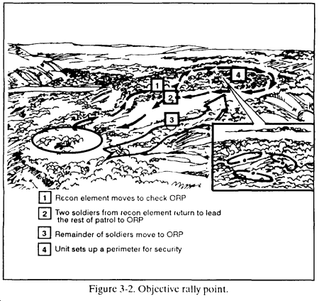 (3) Objective rally point. The objective rally point (ORP) is a point out of sight, sound, and small-arms range of the objective area. It is normally located in the direction that the platoon plans to move after completing its actions on the objective. The ORP is tentative until the objective is pinpointed. (Figure 3-2.) Actions at or from the ORP include--