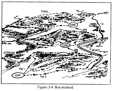 (1) Regaining a lost trail. As soon as the tracker loses the trail, he stops. The tracking team then retraces its path to the last enemy sign. It marks this point. The team studies the sign and the area around it for any clue as to where the enemy went. It looks for signs of the enemy scattering, backtracking, doglegging, or using any other countertracking method. If the trail is still lost, the team establishes security in a spot that avoids destroying any sign. The tracker and an assistant look for the trail. They do this by "boxing" the area around the last clear sign (Figure 3-19). The tracking team always returns to the same path, away from the last sign, to avoid creating more trails than needed.
