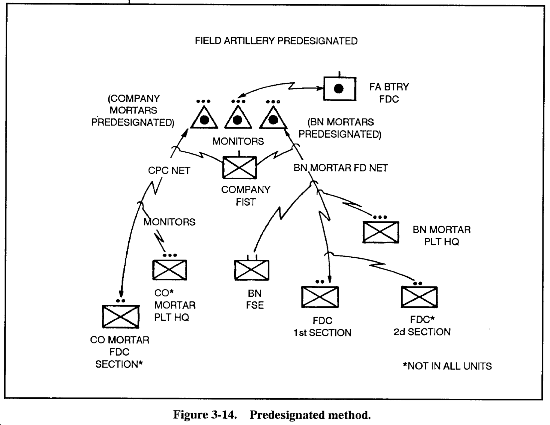 (3) In the predesignated method, the company FSO assigns one/any/all FOs a fire net in which to operate. This option includes provisions to assign two FOs to one net. Net assignment is dependent upon tactical considerations. Platoon FO can request as many missions as he desires and all nets are monitored by FIST HQs. If the FO requests the use of an asset other than his predesignated asset, he must coordinate with FIST HQs. If an FO is given a different asset for a particular mission, he will return to the original predesignated asset upon completion of the mission. Predesignation cannot last for the duration of an operation. This method is highly responsive, provides positive control by the FIST HQ, and prevents net overload (Figure 3-14).