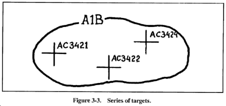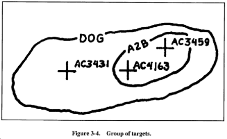 (4) Group of targets. A group of targets consist of two or more targets upon which simultaneous fire is desired. It is graphically shown by circling the targets and identifying the group with a group designation number. The group designation number consists of the two letters assigned to the brigade and a sequence number inserted between the two letters. For example, if the brigade's target numbers begin with the letters AB, the first group of targets is designated A1B; the second group A2B. The fact that a group of targets has been formed does not preclude the attack of individual targets within the group. An artillery battalion is normally the lowest echelon capable of planning and executing a group of targets; however, mortar targets maybe included within a group of targets (Figure 3-3).