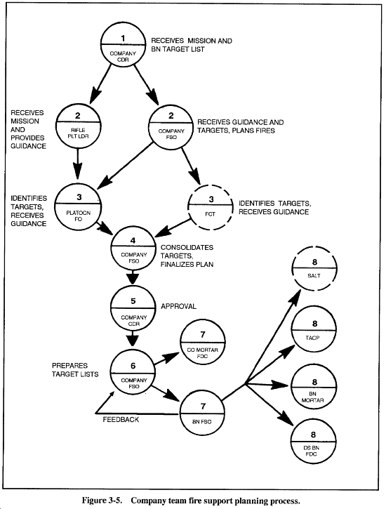 During bottom-up refinement of the top-down planning process, the forward observer in each infantry platoon identifies any additional targets as directed by the platoon leader. He then forwards his additional targets to the company FSO who further refines the fire plan to support the company commander's scheme of maneuver and his intent for fire support. The company commander forwards the list of additional targets to the battalion fire support element. A copy is also given to the company mortar platoon or section (Figure 3-5).