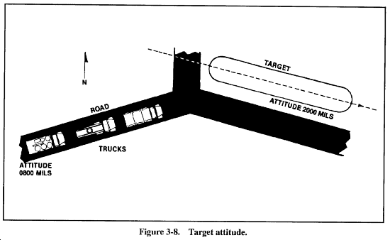 (6) Attitude. The attitude of a target is the direction (azimuth) from north in mils of a linear or rectangular target along its long axis. It is used with target length and width to enable the computation of data to provide a special sheaf, or the determination of multiple aiming points to engage the total target area (Figure 3-8).