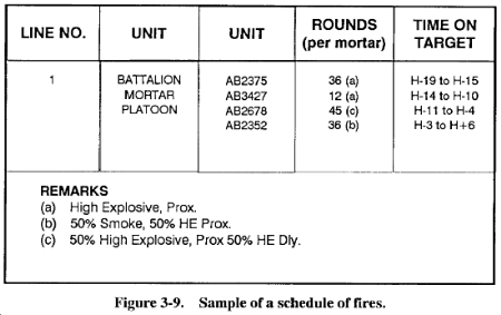 d. Implementing instructions are also provided in the form of schedules for firing. Schedules are prepared for firing a series, a program, a preparation, or a counterpreparation. Regardless of the type of schedule provided, they direct the firing of the mortar platoon onto designated targets at a specific time. The schedule designates the TOT and the amount of rounds to be fired, or it gives the TOT and the duration of fire (for example, TOT H-5, duration four minutes). The mortar platoon leader studies the schedule of fires closely to determine the ammunition required and the target shifts involved. The FSO plans a one-minute shift time for mortars. The platoon leader synchronizes his watch with the FSO, and keeps the platoon on the schedule. If the rounds scheduled for a certain period are not all fired by the shift time, the mortar squads check fire, shift, and stay with the schedule. Any targets not fired are reported to the FSO immediately (Figure 3-9).