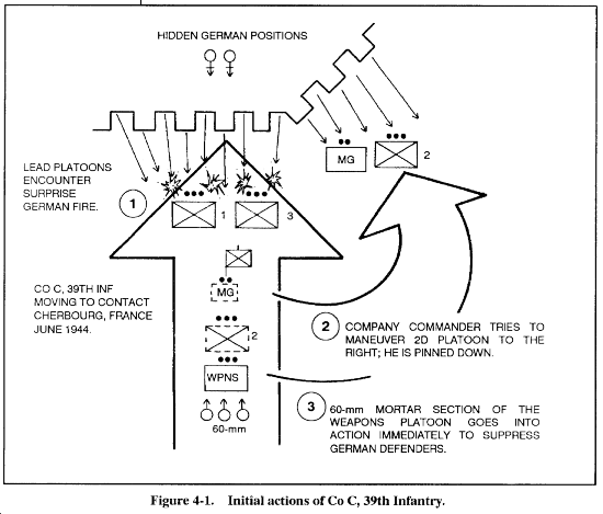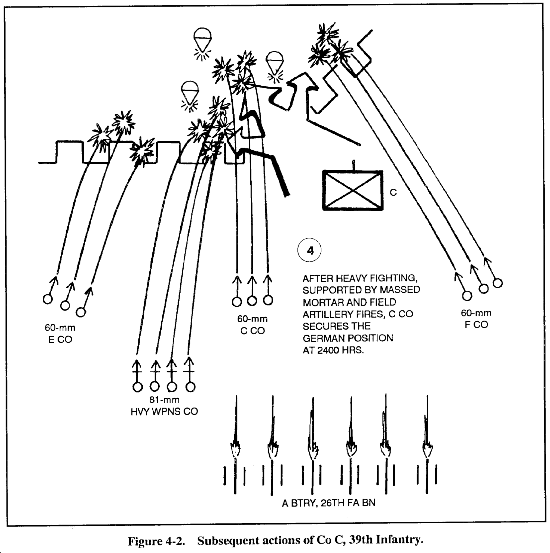 An excellent example of the integrated use of mortars to support an infantry attack occurred during the operations of Company C, 39th Infantry Regiment, 9th Infantry Division at Cherbourg, France, in June 1944 (Figures 4-1 and 4-2.)