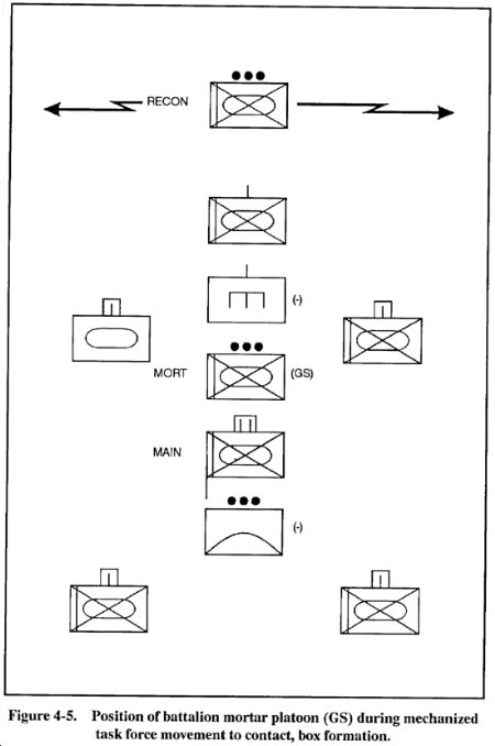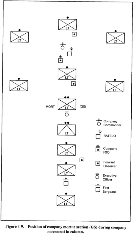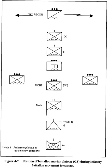 (3) Not only must the commander plan mortar fires, but he must also plan mortar movement. The mortar platoon can be attached, for movement, to a company near the front of the battalion march column or tactical formation. This will ensure that the mortars are close enough to the enemy to contribute responsive, immediate fires (See Figures 4-5 to 4-9 for examples of mortar platoons and sections moving within unit formations.)