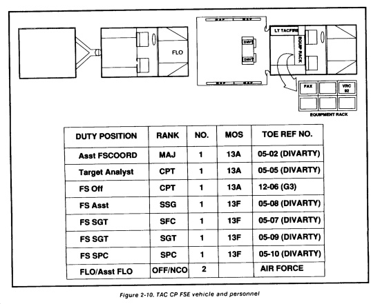 The FSE and ALO in the A2C2 element perform essentially the same functions as those of the TAC CP. Personnel and equipment of the assault CP FSE are those of the TAC CP with required augmentation. The FSE coordinates and synchronizes all fire support assets committed to the current fight. Until the arrival of the DIVARTY HQ and the main CP FSE, the assault CP may perform some of their functions, depending on the situation. The FSE responds to requests for fire support and tactical air support from units committed to combat operations. It also sequences incoming fire support assets into the fight as they arrive. It maintains information to support the commander's critical fire support information requirements and assesses the combat capability of committed units. Figure 2-75 shows the required FSE equipment and personnel.