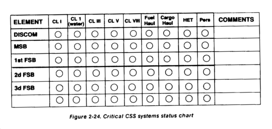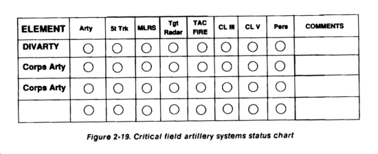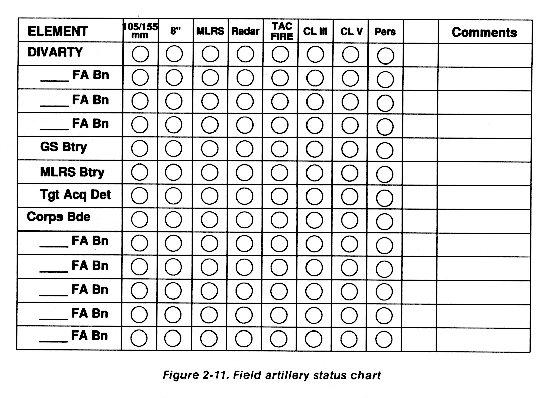 The combat capability status of field artillery is maintained on the same type of charts used by the TAC and main CP FSEs. The rear CP FSE only tracks the status of those fire support units supporting the rear operations. Changes in the status of support are rapidly posted and forwarded to the main CP FSE.