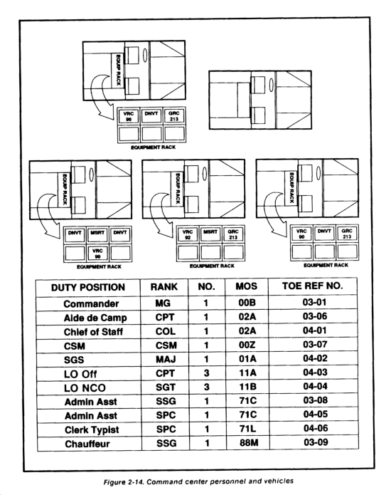 Key to any command post operation is the type and quality of personnel that man it. Regardless of the equipment or facilities, the quality of personnel remains the constant factor that defines effective CP operations. The division's command posts must be staffed with appropriate skills and military occupational specialties (MOSs) to perform the functions of the cell to which they are assigned. Personnel in the CP structure are organic to the division headquarters and headquarters company as well as to other organic and nonorganic elements that support the division. The assigned roles of officers and noncommissioned officers (NCOs) within the structure are critical to the effective functioning of the command post and to mission accomplishment. Each individual must not only be capable of performing his job but also understand how his job relates to others throughout the command post and the system. With the increasing complexity of command posts and equipment that supports them, a soldier must know more than his job's physical processes. He must also know and understand the intangible effects of his job within the command post.
