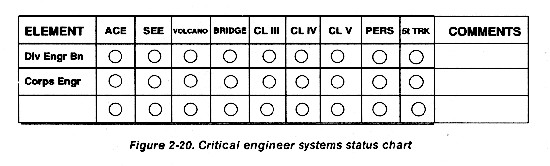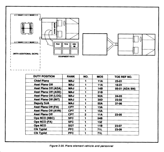 The plans element is included in the assault CP to facilitate future division operations. It consists of selected plans element personnel from the division main CP plans element. During the deployment phase of the operation, the plans element supports the G3 operations element by developing FRAGOs and warning orders to support the current operation. At some point, however, the division will begin planning for a subsequent mission. This will be the task of the plans element. Having deployed early and working in support of the G3, the plans element develops a current, up-to-date working knowledge of the strengths, disposition, and capabilities of units on the ground and those incoming. This knowledge assists the plans element in the planning process parallel to the continuing conduct of the close operation. When the main CP deploys and begins establishing itself, the plans element moves from the assault CP to the main CP to resume normal planning with current information. The plans element should locate as close to the G3 and G2 operations and command center as practical. A diagram of the plans element and required personnel is shown at Figure 2-72.