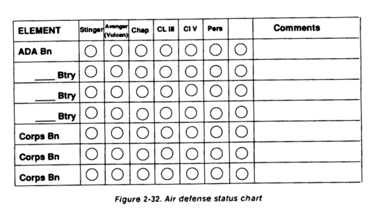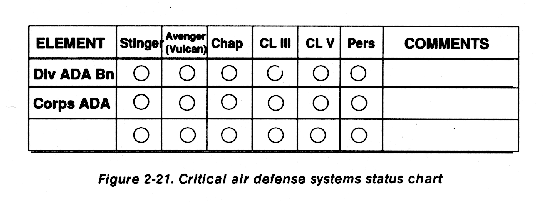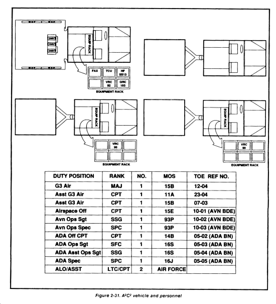 The A2C2 element in the assault CP works for the G3 and coordinates airspace within the division's AO. This element maintains control of air-space to facilitate attack helicopter operations as well as Air Force transport flights into and out of the airfield. It maintains positive control of all AD assets protecting the AO. Figure 2-76 shows the equipment and personnel requirements of the assault CP element.