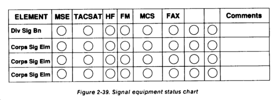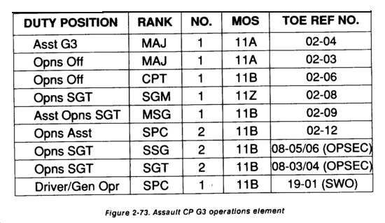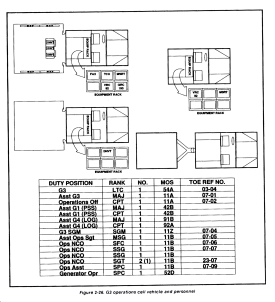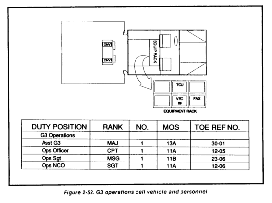 The G3 operations element controls all combat and CS forces (less fire support) deployed on the ground to support the current operation. It comprises primarily the TAC CP G3 element personnel and is augmented as needed. It serves the same functions as described for the TAC CP G3 operations element. It is the NCS for the assault CP and receives, logs, and posts information received from tactical and situation reports. It issues warning orders and FRAGOs to control and fight the current and close operation. It maintains the combat capability status of all committed forces two levels down. It analyzes information received and provides required information to the command center to support the CCIR. Included in the personnel requirements for the G3 operations element is a SJA officer to inform the commander on legal ramifications of operations and COAs. This officer must be knowledgeable of the legal system, procedures, and laws of the host nation. The SJA is a critical element in the assault CP during the early stages of the deployment. The G3 operations element is located adjacent to the command center. Figure 2-73 shows the G3 operations element's required equipment and personnel.